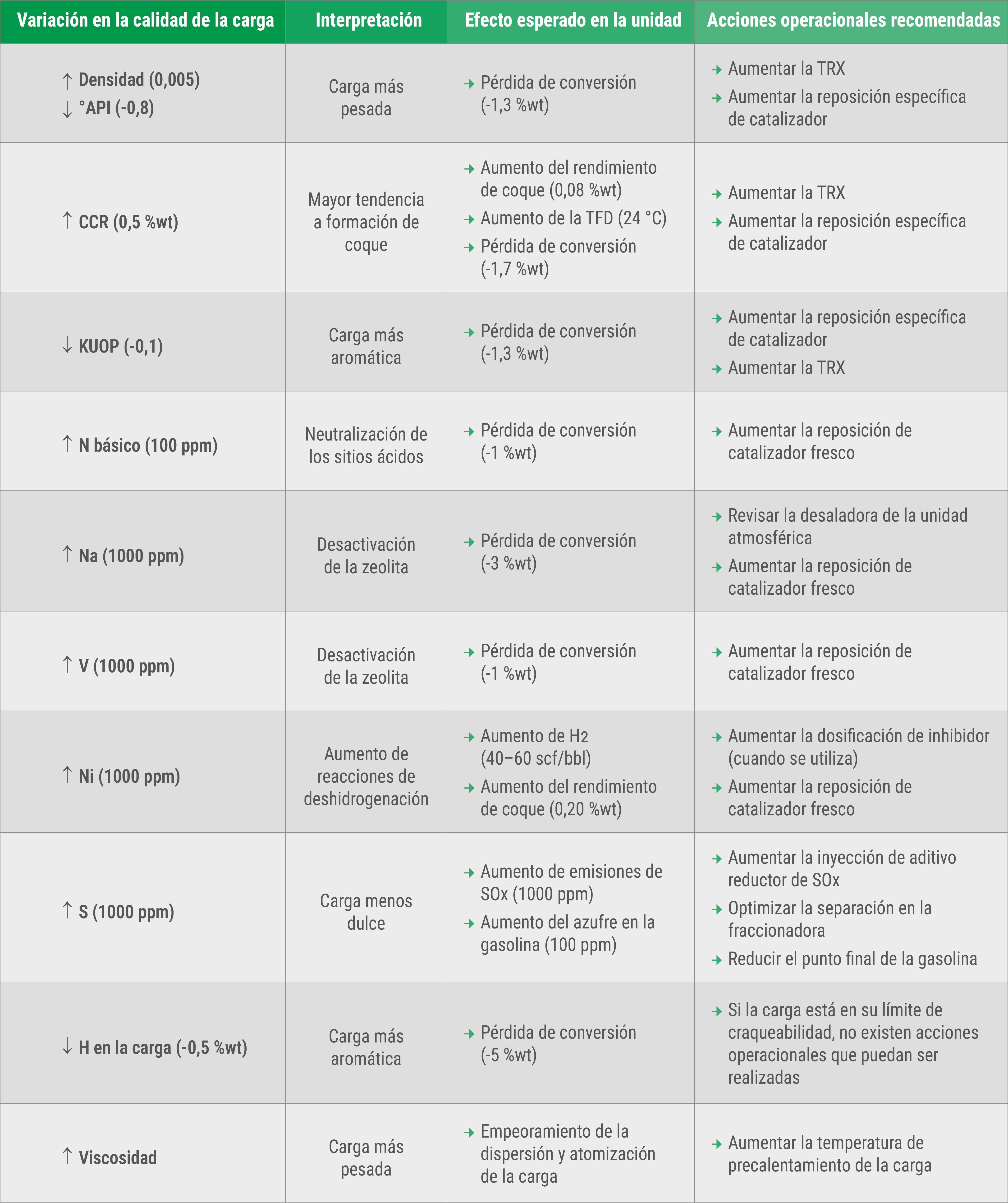Como se puede observar en la tabla presentada, diferentes variaciones en la calidad de la carga pueden generar impactos específicos en el desempeño de la unidad de FCC. La interpretación adecuada de estos cambios permite identificar posibles acciones operacionales que pueden ser aplicadas por el equipo de la unidad para mitigar estos efectos. De esta manera, la tabla puede ser utilizada como una guía rápida de referencia que facilite la interpretación de los análisis de carga y apoye la toma de decisiones en la operación diaria de la unidad.