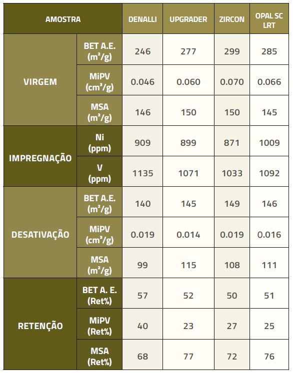 Na tabela I são mostradas as propriedades texturais dos catalisadores virgens e após as etapas de impregnação com metais e desativação em unidade de leito fluidizado. O catalisador DENALI apresentou vantagem na retenção de volume de microporos (MiPV) em relação aos catalisadores TOPAZ, representados nesta comparação pelos catalisadores UPGRADER, ZIRCON e OPAL SC LRT. Esta propriedade está diretamente relacionada com a área de zeólita do catalisador, o que indicou que a nova matriz ADMTM-85, associada à zeólita ADZTTM-600, confere maior proteção aos sítios ativos da zeólita, principal componente do catalisador.