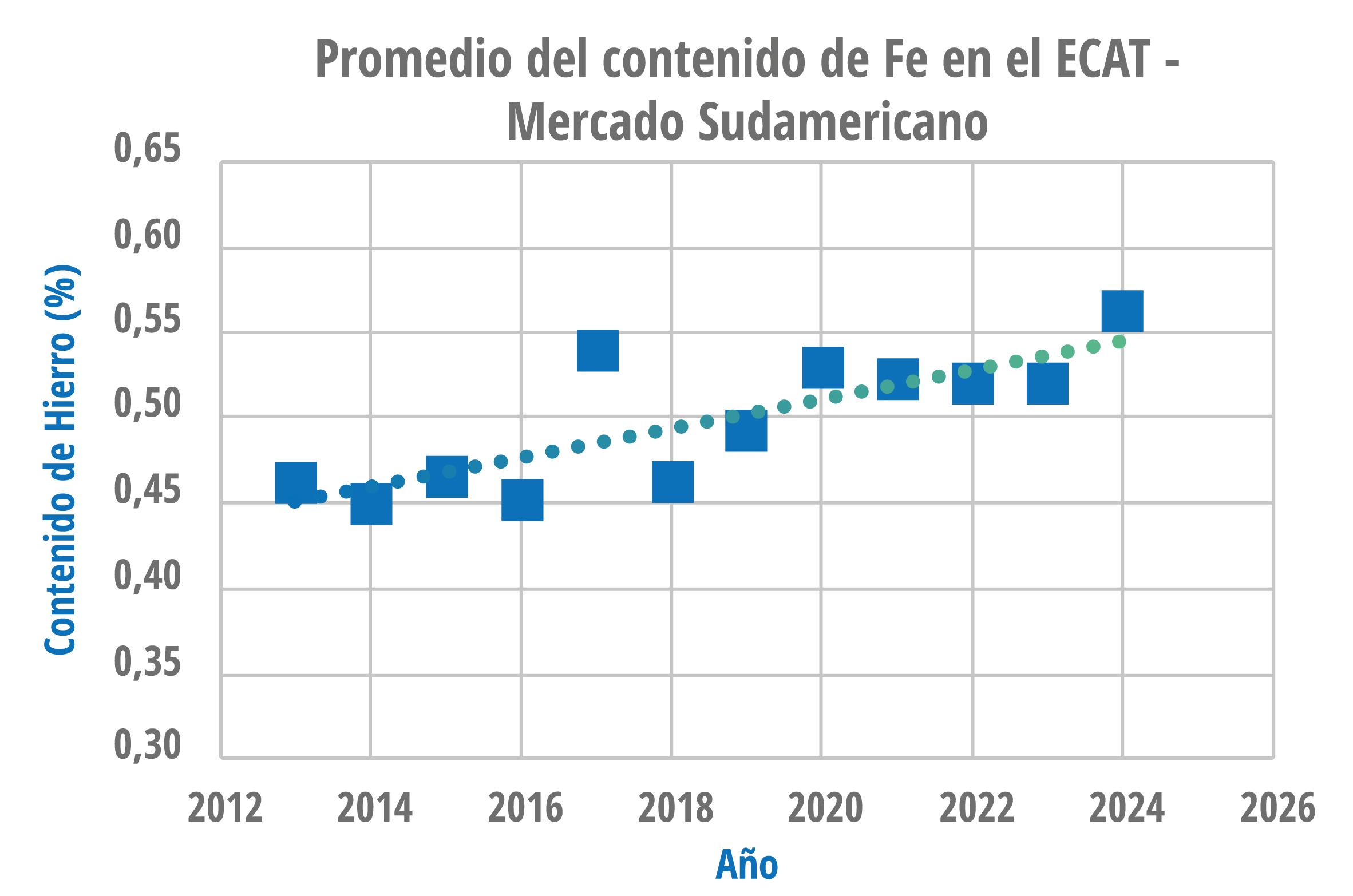 La creciente presencia de hierro (Fe) en las cargas procesadas ha generado impactos relevantes sobre el desempeño catalítico en unidades de FCC. Los datos de mercado indican un aumento progresivo en el contenido promedio de hierro acumulado en el catalizador de equilibrio (ECAT) a lo largo de los últimos años en Sudamérica. Esta contaminación metálica está asociada a dificultades de fluidización, reducción en la accesibilidad de las partículas y formación adicional de coque e hidrógeno, lo que compromete la estabilidad operativa y los rendimientos de la unidad. UPGRADER™, sin embargo, fue diseñado con arquitectura de poros optimizada, garantizando alta accesibilidad incluso en escenarios con elevada carga metálica.