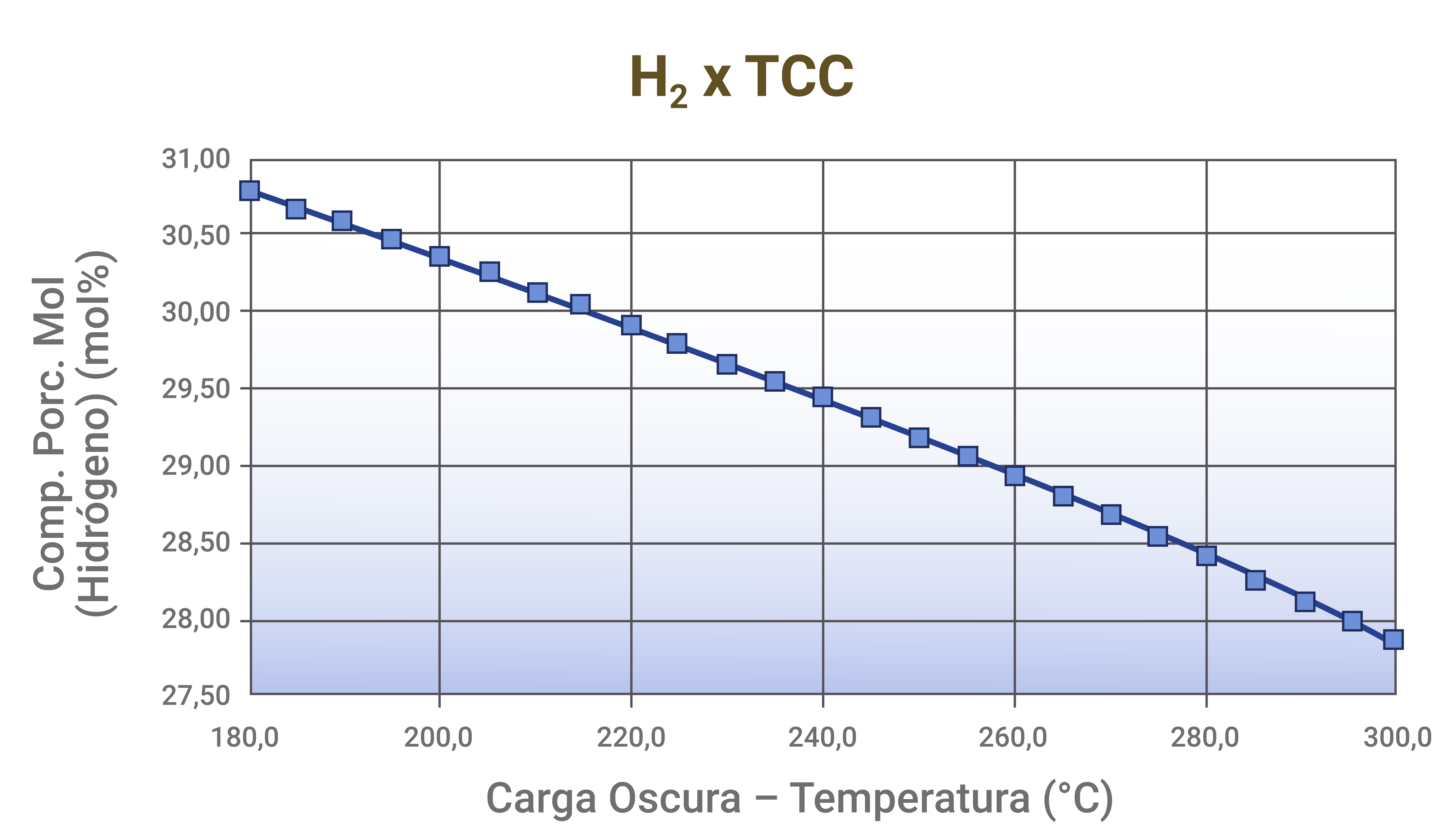 - Aumento de temperatura de reacción: no parece un cambio lógico, una vez que aumenta el rendimiento de gas combustible, pero al favorecer las reacciones de craqueo catalítico el aumento de temperatura de reacción reduce la concentración de H2 en el gas combustible, como muestra el ejemplo obtenido a través de un simulador de procesos: