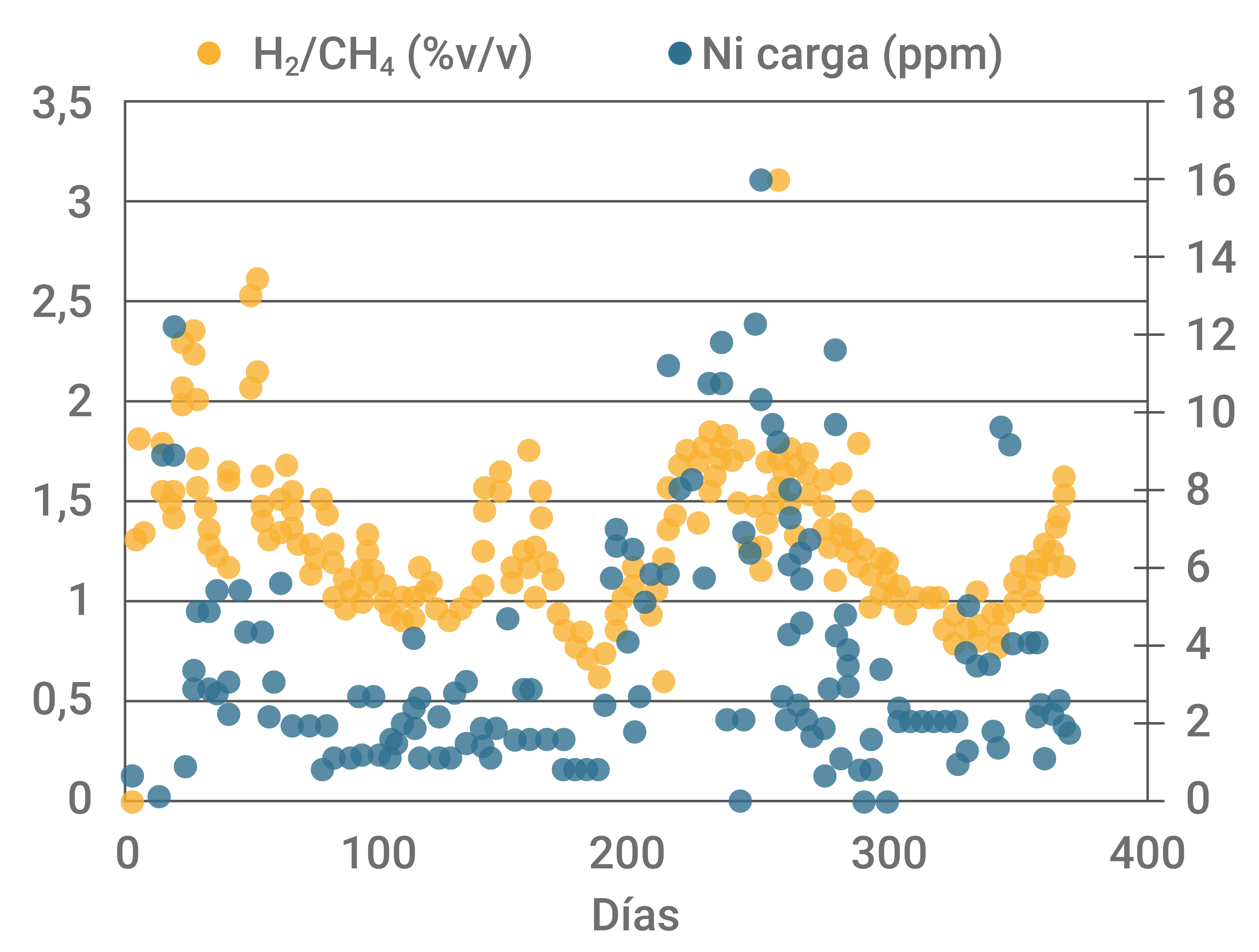 El siguiente gráfico muestra la correlación de la tendencia entre el aumento de níquel equivalente y la relación H2/CH4 de la unidad. Se destaca la acción deshidrogenante en picos de níquel equivalente en el inventario.