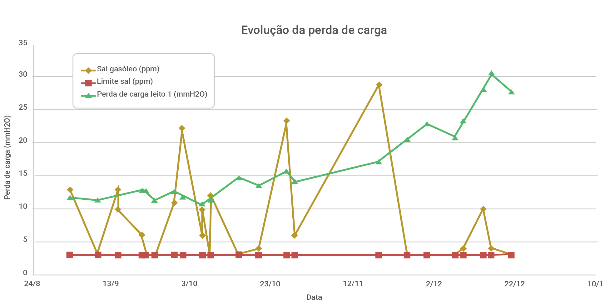 A maneira mais fácil de fazer isso é criar gráficos de acompanhamento dos últimos meses (sugerimos cerca de 6), um com a perda de carga entre a região do refluxo de nafta pesada e o topo da fracionadora principal (o sal costuma se depositar nos pratos de topo) e outro com a diferença de pressão entre o topo da fracionadora principal e a sucção do primeiro estágio do compressor de gás úmido. Dessa maneira fica fácil identificar no dia a dia mudanças que indiquem o início da deposição de sais, de modo a permitir ações de mitigação.