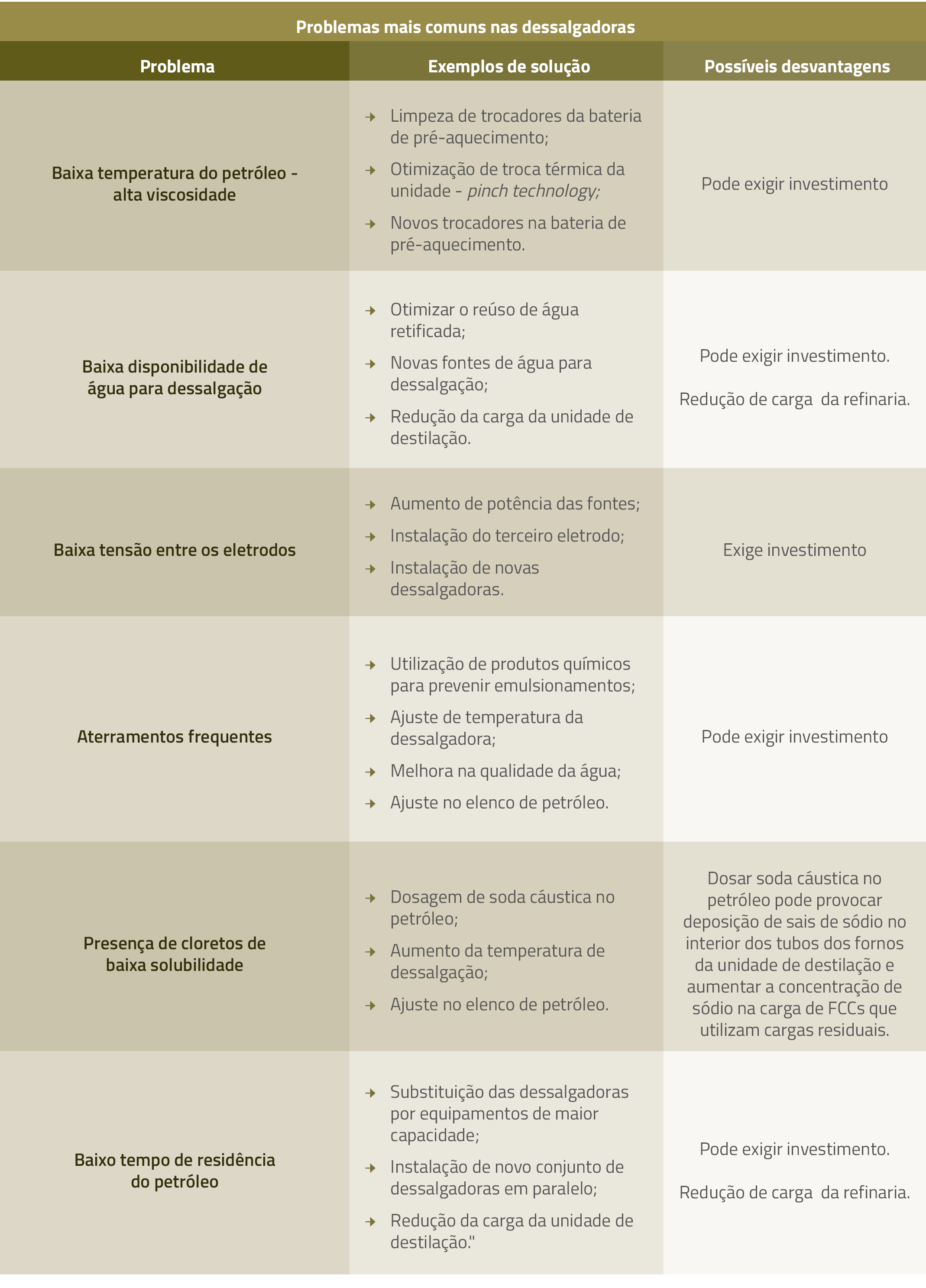A tabela a seguir apresenta alguns dos problemas mais comuns em sistemas de dessalgadoras e suas possíveis soluções:
