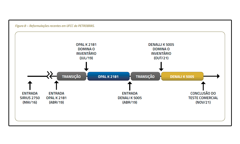 O catalisador DENALI substituiu o catalisador UPGRADER, que representava aproximadamente 50% do inventário no sistema OPAL K 2181. Foram mantidas as proporções dos demais componentes em relação ao sistema catalítico anterior. O novo sistema DENALI K 5005 foi enviado para a refinaria em 19 de maio de 2021, entrou efetivamente na unidade de FCC em junho e passou a dominar o inventário da unidade em 04 de outubro de 2021 (75% de troca).